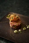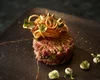 Gebruik een steker (kookring) om de tartaar mooi rond op het bord te presenteren. Leg een aardappelnestje op de tartaar en besprenkel met een snufje zout. Garneer met enkele toefjes truffelmayonaise en de kiemgroenten