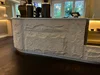 Je blik wordt meteen getrokken naar de bar, die opvalt door het reliëf in de stenen constructie. De bar is het hart van het interieur, terwijl de rest van de ruimte vrij minimalistisch is gehouden.